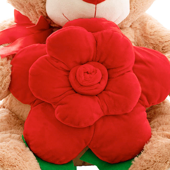 Meet Kev, the charming Brown Teddy Bear. Featuring a satin ribbon bow around his neck and holding a delicate red velvet rose, Kev brings a touch of romance and elegance. With his soft fur and thoughtful details, he makes the perfect gift to express your affection in style. Standing 80cm tall from head to toe and 55cm when seated, Kev is sold individually.